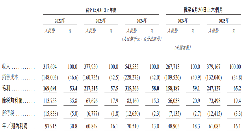 业绩方面,2022年、2023年、2024年及2025年截至6月30日止六个月,望圆科技实现收入分别约为3.18亿元、3.78亿元、5.44亿元及3.79亿元人民币;同期,年内/期内利润约为9791.5万元、6084.9万元、7051万元及6108.3万元人民币。